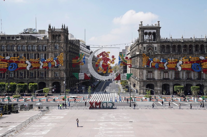 Decorations are seen on buildings to commemorate the 500th Anniversary of the Fall of Tenochtitlan, at Zocalo Plaza in Mexico City, Mexico, August 10, 2021. REUTERS/Toya Sarno Jordan