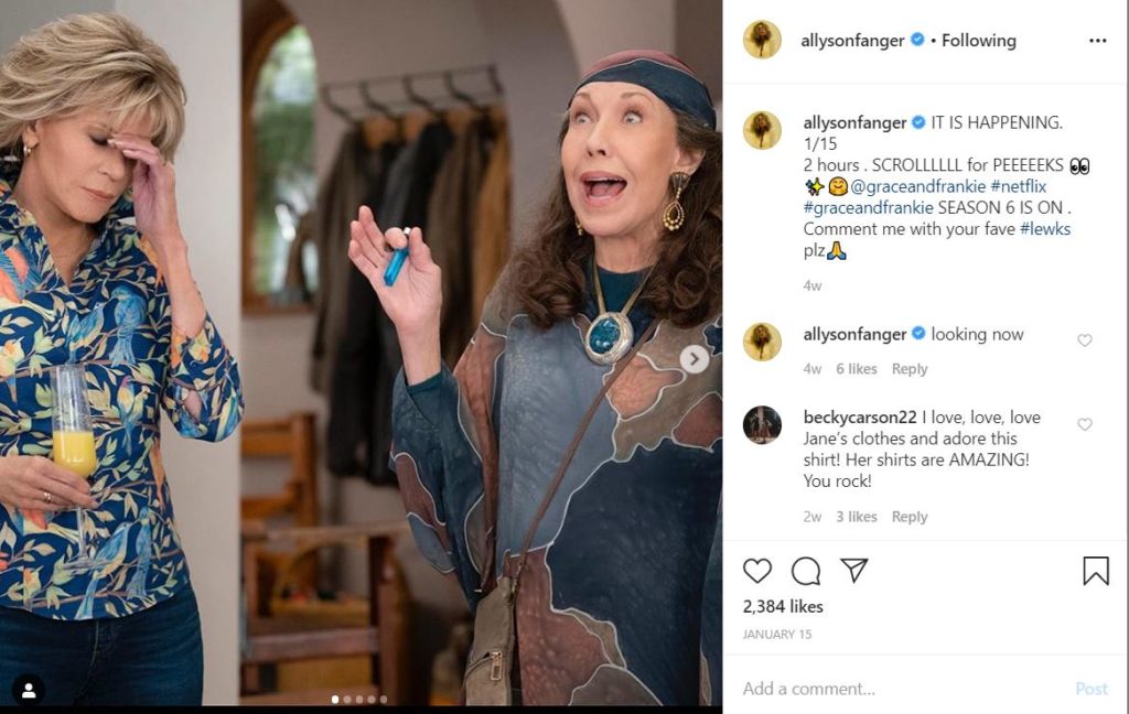 We are huge fans of Grace and Frankie, the Netflix Show starring Jane Fonda and Lily Tomlin. When it comes to Grace and Frankie’s clothes, Tomatoes go crazy for them! Some of our most read articles are about their style, so we were over the moon to have the chance to interview the show’s Emmy-nominated costume designer Allyson B. Fanger on our Happy Hour Podcast. Not only did share the behind the clothes stories, we also are huge fans of her on Instagram where she has shared sneak peeks of some of the clothes for season 7, the last season. (boohoo.) Listen in to the podcast and check out some of next season’s looks too.