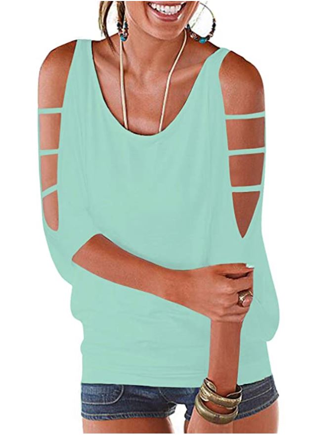 Scoop neck, cut out shoulder, hollow out, batwing sleeve, banded bottom tops. Amazon $21.00