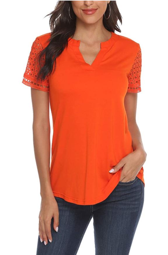 Lace short sleeve, Classic notch v-neck, flare front, pleated back, (hides tummy too.) Amazon. $21.00