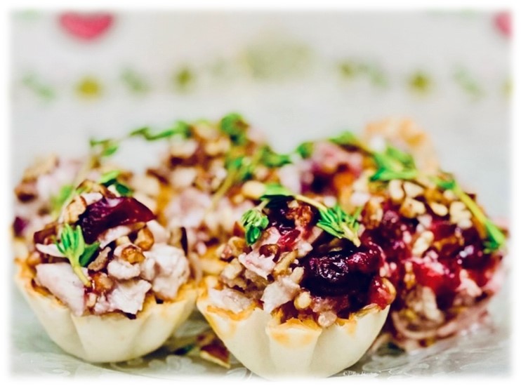 INGREDIENTS: 4 to 6 white meat chicken tenders; ¼ teaspoon ground ginger, ½ teaspoon Reva Paul seasoning mix*; ¼ cup cranberry – orange sauce; ¼ chopped, roasted pecans, 2 to 3 Tablespoons Mayonnaise; 1 teaspoon white vinegar; sprigs of fresh Thyme cut into 12pieces. 12 Phyllo or Tart Shells