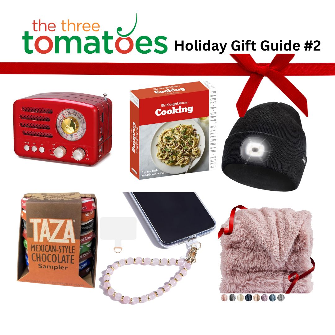 The Holiday Gift Guide #2 features a variety of unique and practical gifts perfect for the season. These include a Vintage Transistor Radio with Bluetooth for a nostalgic yet modern touch, The New York Times Cooking Page-A-Day® Calendar 2025 offering over 300 curated recipes, a USB rechargeable Hat with a Light for night walks, Taza Mexican-Style Chocolate Discs for a delicious treat, a luxurious Cozy Throw Blanket for ultimate comfort, and a Cell Phone Wrist Strap for convenience and style. And every gift is under $25.00.