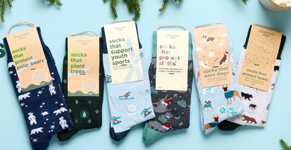 Organic cotton socks in playful designs, each pair tied to a nonprofit cause—from rainforest protection to LGBTQ+ rights.