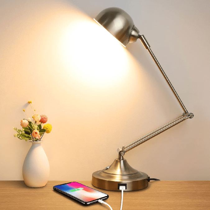 We have this lamp on our desk and love it. It’s an LED lamp with 3 colors, and USB Charging Port, Swing Arm, Fully Dimmable. Amazon $59.99