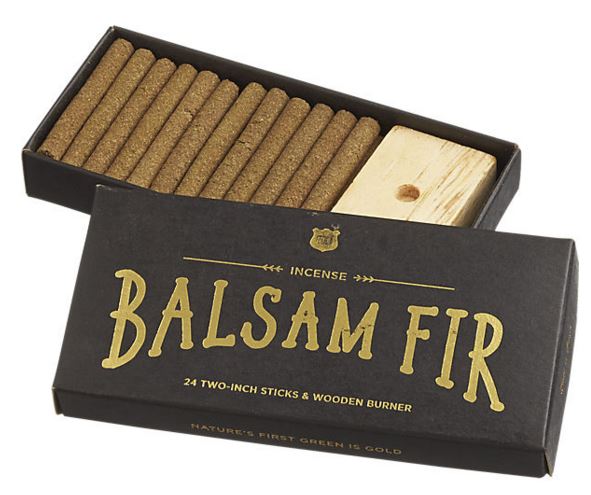 Venture deep into the woods with the foresty scent of fresh-cut evergreen. Concentrated into mini sticks of incense, balsam fir wood and needles burn pure and neat in a handcrafted pine holder. Packaged in a giftable gold foil-printed box. cb2 $14.95