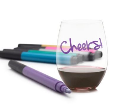 Simply write anywhere on the glass, bottle or plate. Let it dry for 3 to 5 minutes and it will stay on for the life of the party. The marker ink washes off easily with warm soapy water. Amazon. $12.99.