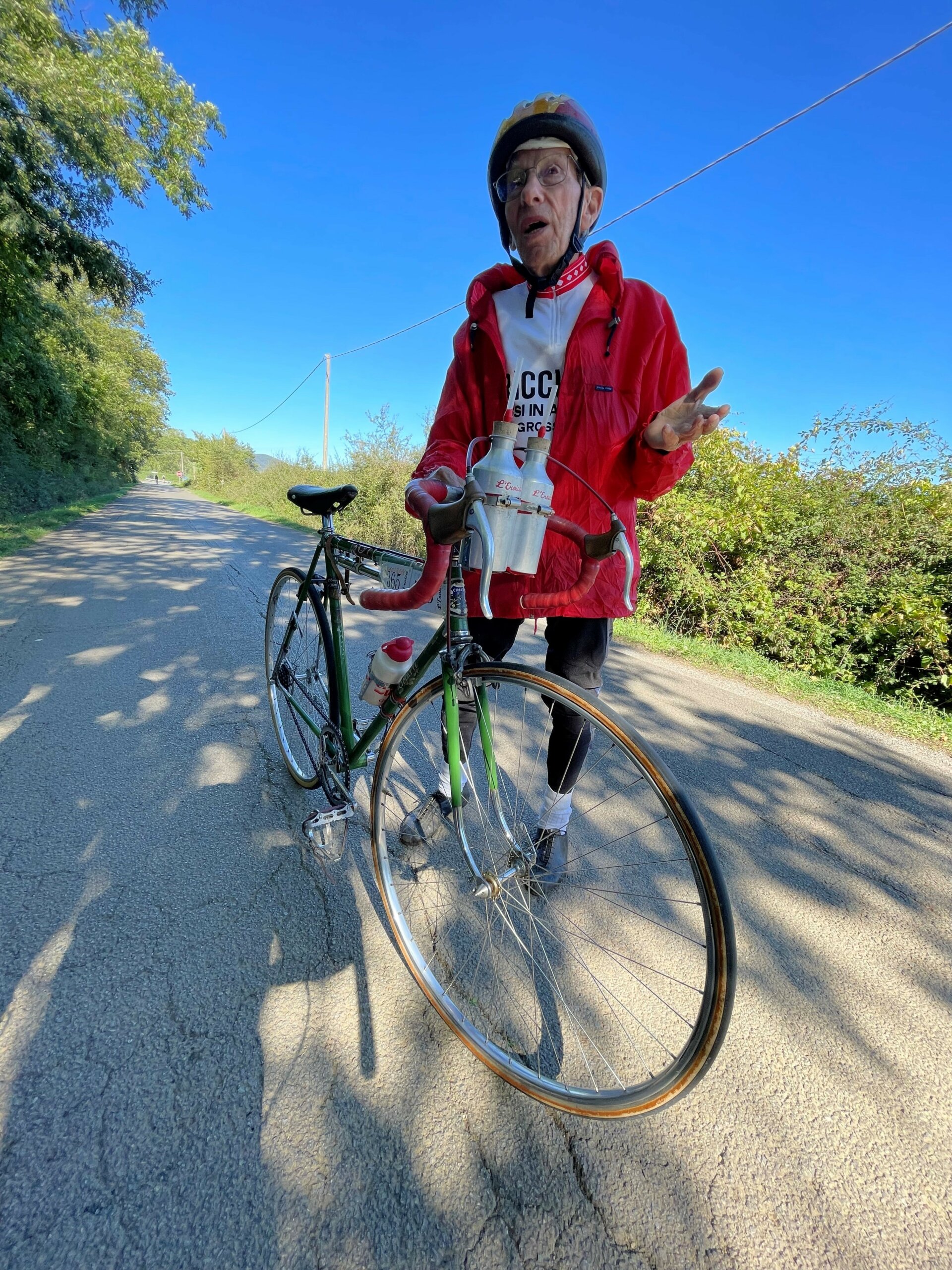 We came upon a man who is 91 years old. He was way out on the back roads by himself on a bicycle. It wasn’t just any bike. It was a 1970’s bike. He participates in the L’Eroica in Tuscanny, Italy, a race on ancient roads using obsolete bikes. Only bikes made prior to 1987 are allowed to enter.