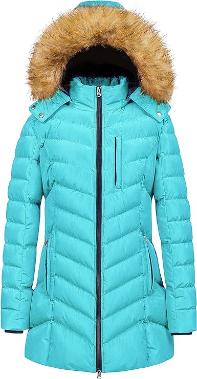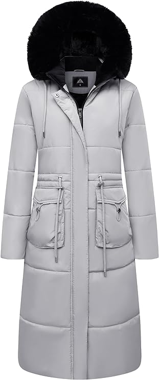 A stylish long puffer. This long winter down jacket made with durable 100% water resistant polyester shell, warm down cotton fill, and upper thicken fleece lining. Amazon $75.00.