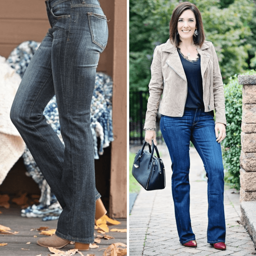 And a quick note on the length of bootcut and flare leg jeans – they should be long enough so that the front hem reaches the top of your bootie near your toes, and the back hem is at least midway down the heel (like in the above photo). But they shouldn’t be too long so that extra denim puddles at the top near your toes, and definitely not so long that the back hem drags on the floor. Make sense?