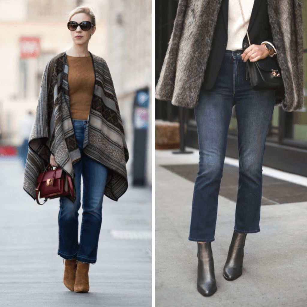 Cropped straight or flare jeans are on trend right now, and they’re pretty darn cute. And since they have a wider leg opening, they follow the guidelines for boot/flare leg jeans – ideally, the bootie shaft slides up under the jeans. But since these jeans are cropped, that might not always work – so it’s totally okay if a little skin shows. But if you’re showing over an inch of skin, the jeans are probably too short for the booties. Booties that are snug to your ankle are best with cropped jeans, too, to minimize the jeans getting stuck on the top of your booties. And if your denim wardrobe is lacking and it’s finally time to find jeans that work for your body and your lifestyle, read about my virtual services here where we can create a wardrobe that feels great and expresses your true personal style.