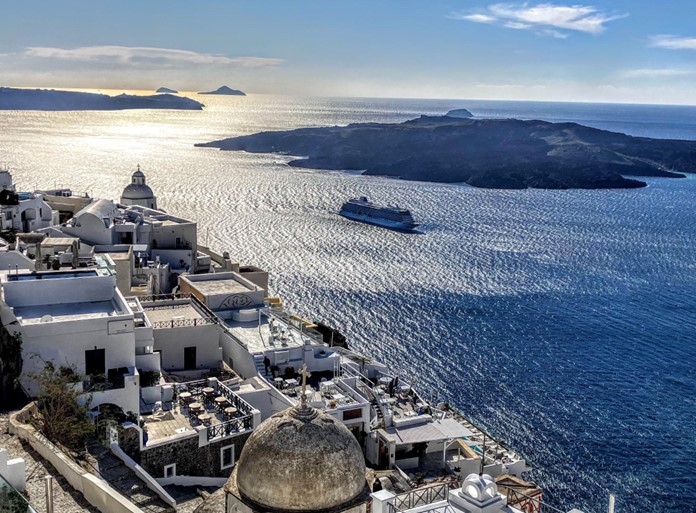 Viking Sky anchored off Santorini, Greece (Photo © David Stewart White)