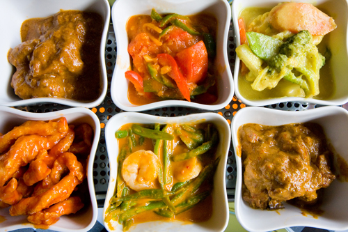 - Six assorted meat, fish and vegetables as “main courses” which were served with rice:Lamb curry, which was well spiced and tender