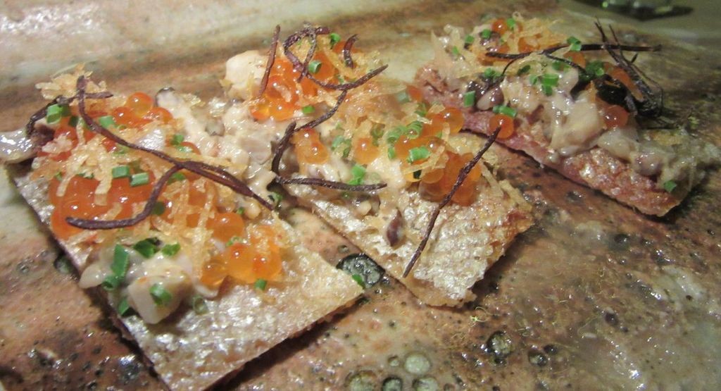 A thick cut of Tasmanian sea trout in a soupy mix of trout roe, ponzu, and grated raw nagaimo stands out from the Kaiseki opening at Shuko. Trout and trout roe on crisp trout skin with a few grains of seaweed salt is another genius whim I remember. I’m not sure what was in my cognac cocktail but that — and the sideshow of watching Jimmy Lau organizing beds of Santa Barbara sea urchin — definitely turned up my sensory focus. 47 East 12th Street between University and Broadway.