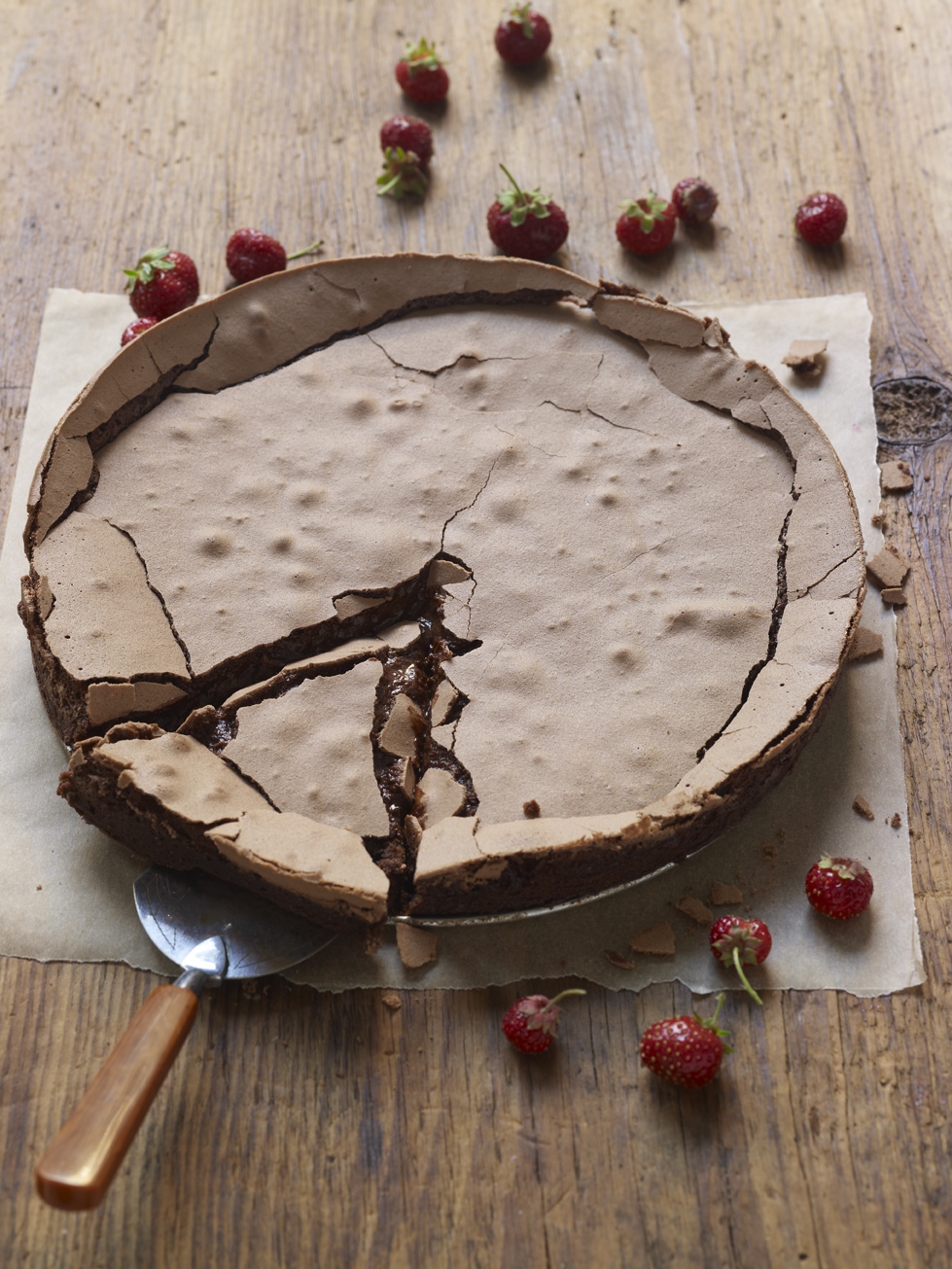 Flourless cake with a crisp, macaroon-like top layer and a dense, incredibly moist center. As the cake cools, it collapses just a little, creating a pretty webbing on the delicious crust.