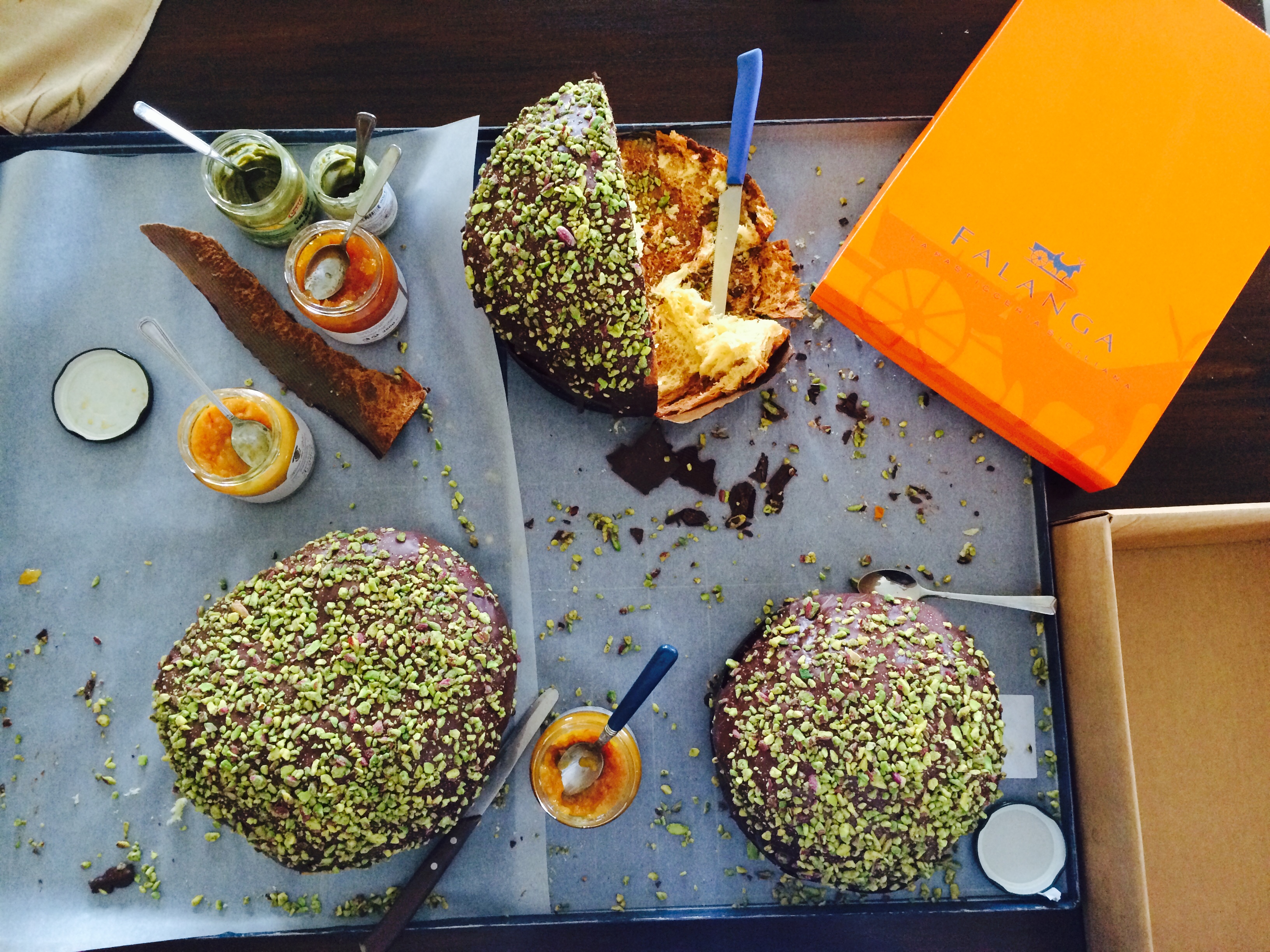 Panettone making follows an extraordinarily elaborate and time-consuming process—taking over 40 hours. It’s kneaded and left to rise several times before baking, with flour, eggs, butter, sugar, and candied fruit added in stages. At last, once each cake has been allowed to rise in its own little panettone paper container, it’s baked, cooled, wrapped in plastic, packed up by hand, and sent on its way. There are even variations covered in chocolate and pistachios.