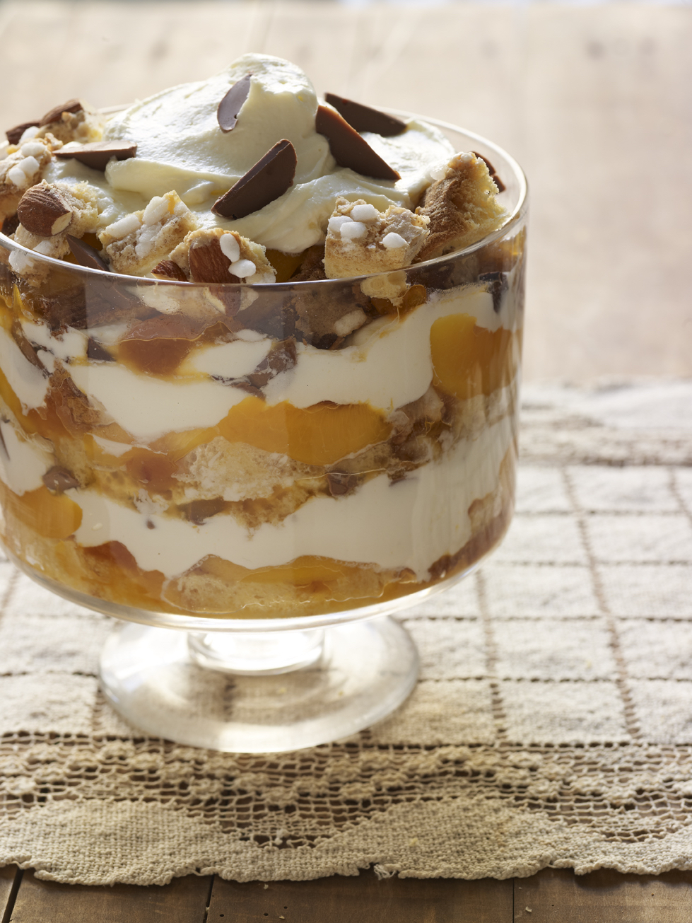 In serving glass, layer slices panettone, splash prosecco or Asti Spumante, peaches, chocolate, whipped cream. Top with pretty sugar & almonds, if you like.