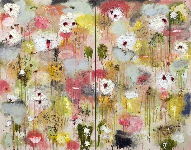 “Symphony VII”, 2014, Oil, acrylic, paper mache, pastel, silk, berries, and dried sunflowers on linen  in two parts, 54″ x 108 1/4″ overall