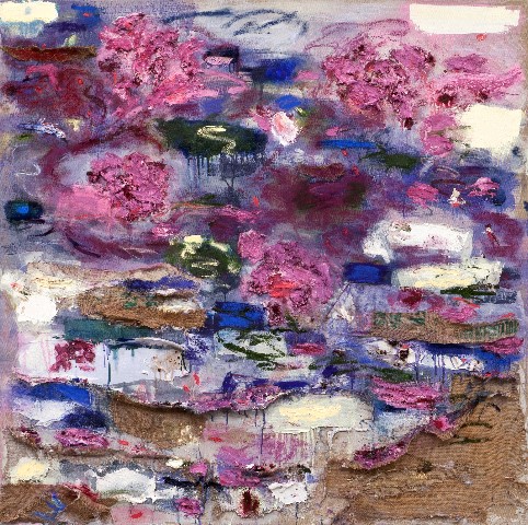 A rhapsody of contrasts, thick strokes of white, ultramarine, and deep violet paint layered with strips of translucent white silk, form a background for rose pink flowers in “Burlap & Silk”. The roses hover above roughly cut remnants of burlap, a texture recalling the earth itself. This coarse fabric twists and curls, creating areas extending outward from the painting’s surface. Sagging from the weight, they enfold jeweled colored curds of rose and purple color inlayed with dried flowers and seeds.