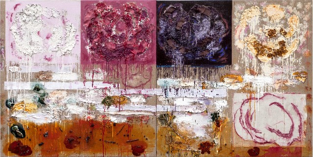 “Amor Matris”, 2015, Oil, acrylic, paper mache, paper etching fragments, rosebuds, twigs, and glitter on canvas, 66″ x 84 1/2″ overall