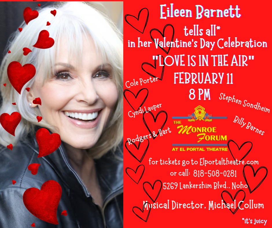 With Valentines Day on its way love is indeed in the air and you will LOVE Eileen Barnet in her one woman show “Love is in the Air” at the El Portal Theatre. You don’t want to miss this consummate, charismatic, elegant and supremely talented Tomato when she takes the stage. Eileen has one of the most glorious singing voices I’ve ever heard, Tomatoes.