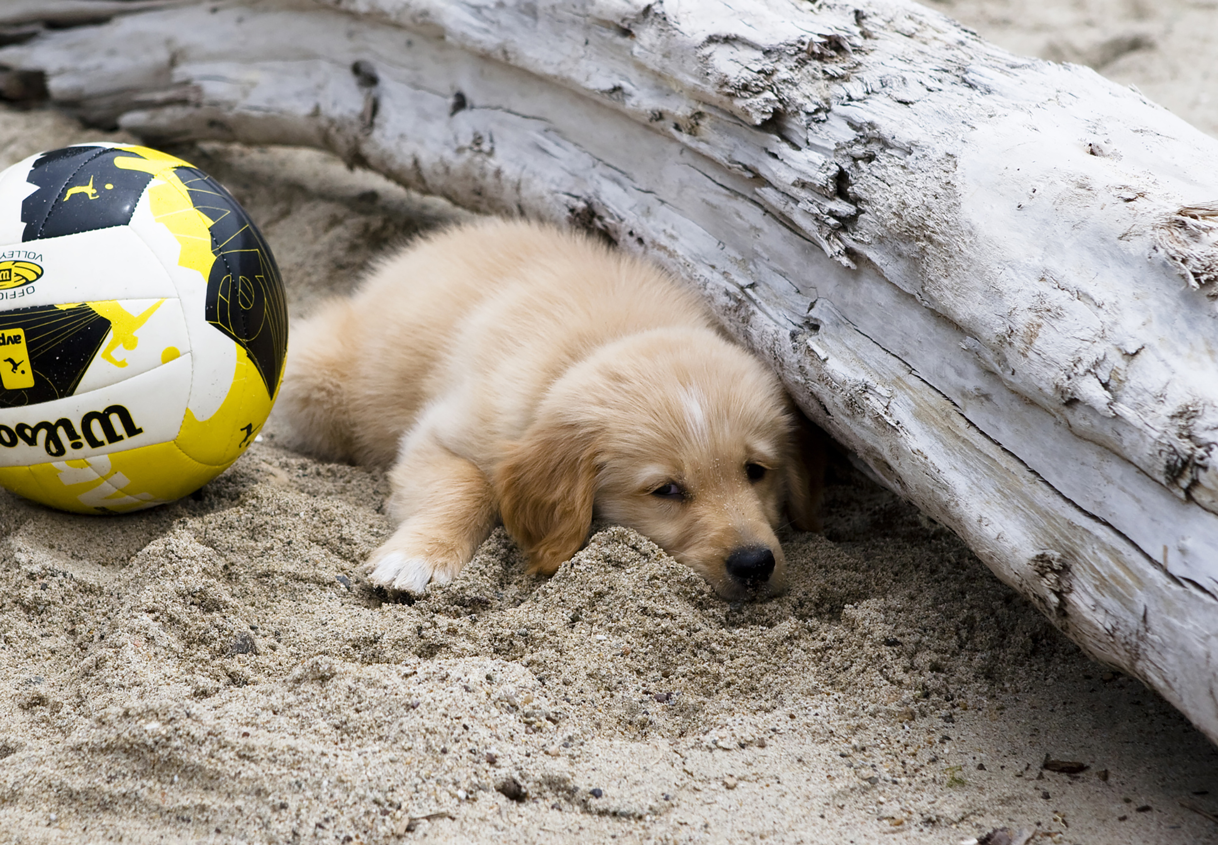 Los Angeles is a dog city. You can’t walk, drive, bike, mosey, or meander down any street, in any park; any beach or backyard and not see dogs everywhere. Dogs of every type, age, style, and breed seem to accompany Los Angelenos of every type, age, style and, well, personality, and it usually proves true that the act of walking a dog is the surest way to meet your neighbors, make new friends, or simply charm giggling children or ambling seniors. And if you really want to ratchet up the engagement factor, get a Golden puppy. This darling boy named Bowie surreptitiously (since dogs are, sadly, not allowed on most LA beaches) found his way to a beach and a ball, and exhausted himself playing soccer with his teenaged human. Finally taking a break, his very puppy-like pose elicited plenty of, “omigod, how cute!!” commentary from passersby. We call this photo, “He Bent It Like Beckham.”