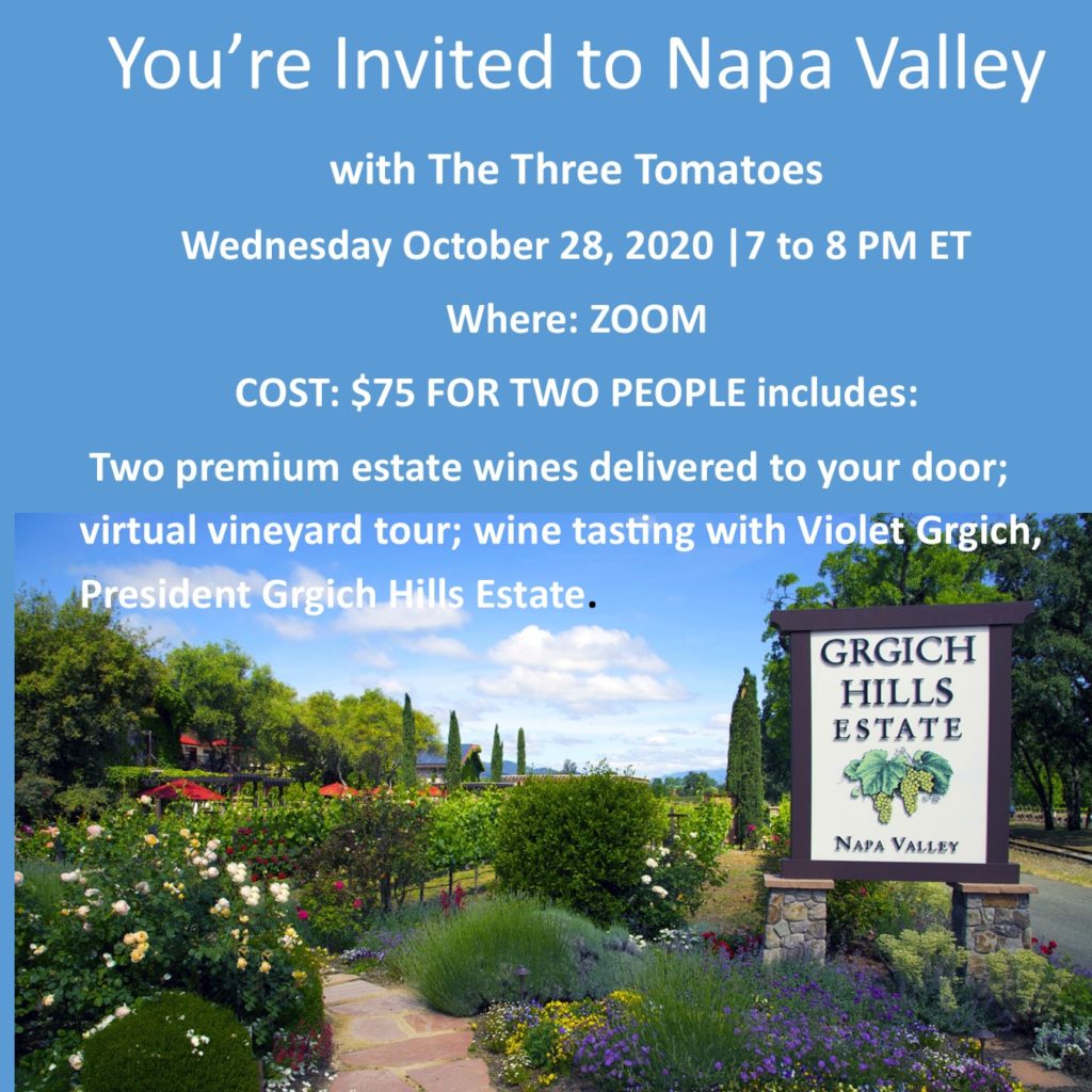 Attention wine loving friends. This is the ultimate Napa Valley wine tasting experience to one of their most prestigious vineyards, Grgich Hills Estate. Your award-winning premium wines (for two people, or just for you) for the tasting can be ordered in advance and delivered to your door before the event (if ordered by Oct. 14th.) And we will have an exclusive tour and conversation with the winemakers. RESERVE YOUR ZOOM SEAT. https://www.thethreetomatoes.com/napavalley