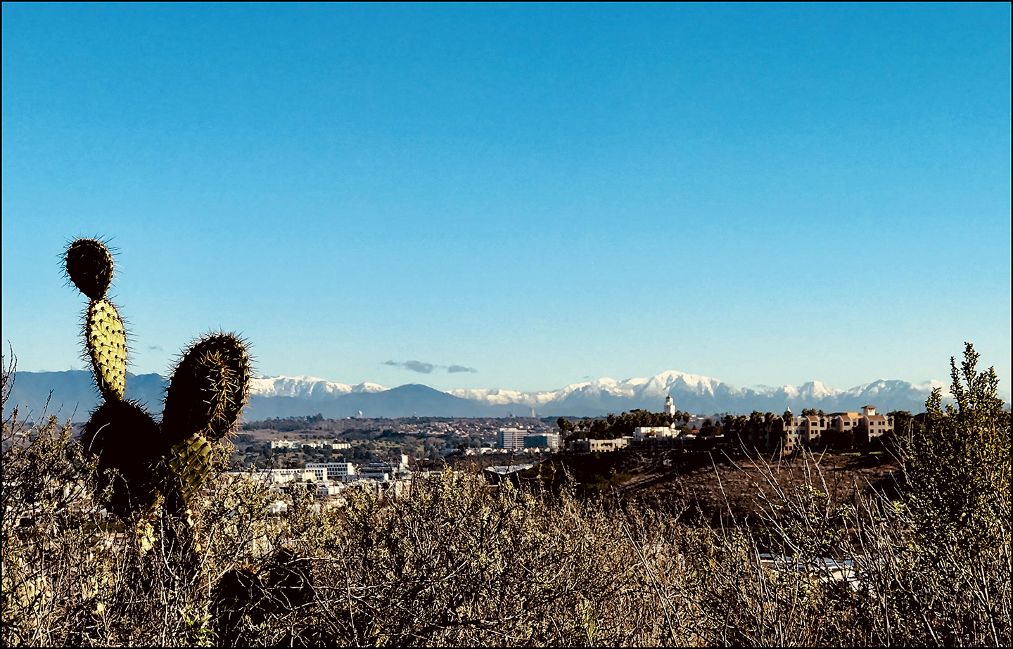 When I was a girl growing up in Illinois, a young singer out on midwestern roads with a rock band, or a visiting adult back to traverse the state after my move to LA, I never failed to notice that most salient trait of midwestern terrain: flatness. Its sheer flatness. You could drive through good parts of Illinois, Kansas, or Nebraska and have so little obstruct the view that your eye would hit the horizon with nary an interruption. Which had its own kind of beauty, surely, but I was always drawn to the visual disparity and excitement of mountainous terrain. Probably because of those formative years of flatness. Living now in the gorgeous surrounds of Los Angeles, I am greeted daily by any number of views, and most include my beloved mountains: The Santa Monica range that curves around the westside beach cities. The Santa Susana’s framing San Fernando Valley. The Verdugo Mountains are to the east, and, as captured in this photograph, “Mountain View Through Cactus,” the stunning, often cloud-covered, San Gabriel Mountains. These you might know from the ubiquitous Rose Bowl blimp shots that always seem to find the mountains at their most beautiful. As much as the tourists swoon, we locals never tire of their drama whenever they do decide to come out of the clouds.