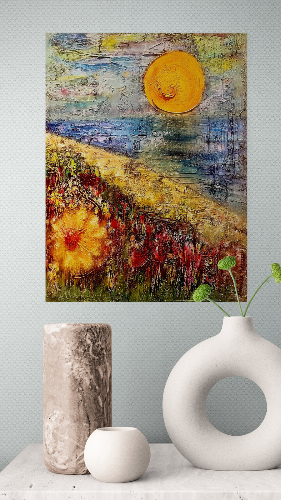 “I had prepped a canvas with shapes and texture, then a month later revisited it to create something, and low and behold, the shape of a sun was already there, like it was always there.”
