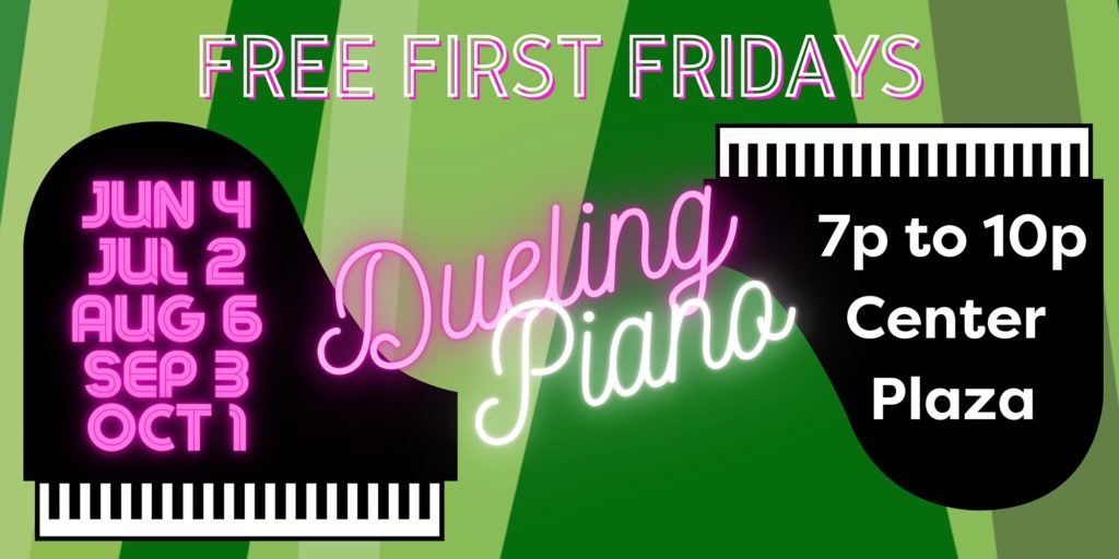 Next up is Friday July 2nd. The Dueling Piano shows are seated, socially distanced events with shows at 7, 8 and 9pm but you need to register ASAP because free tickets are on a first come first serve basis. And if you would like a pair of headphones, be sure to check in early as those are also available on a first come first serve basis. Safety protocols are in place so you can really relax and rock to the beat of 2 fab pianists doing their thing!