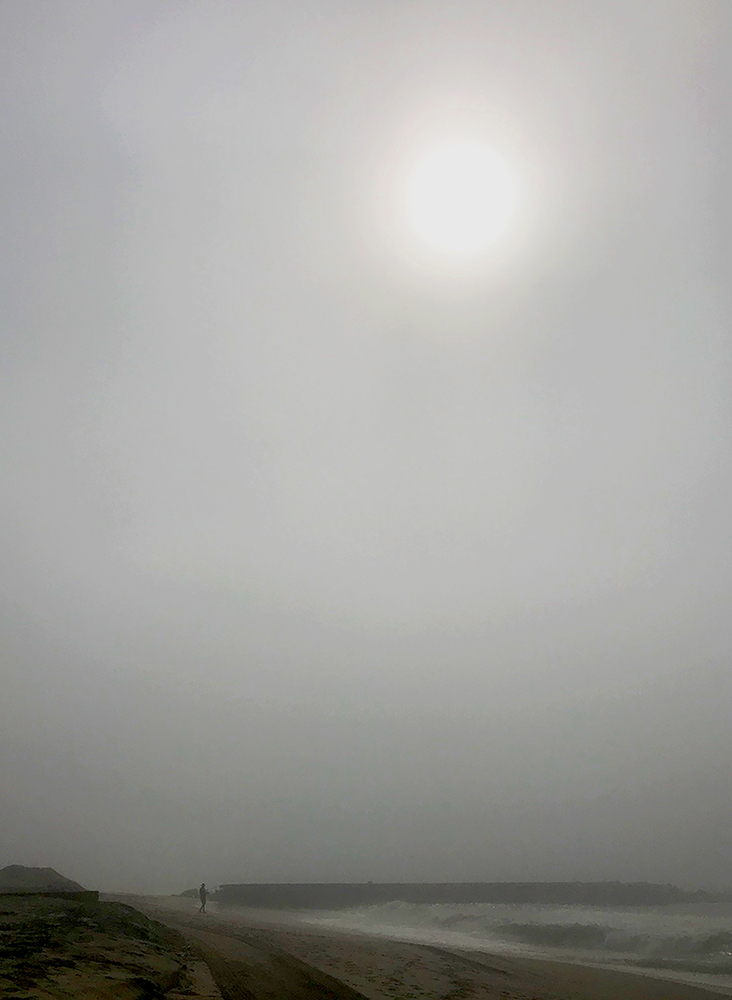 Everyone’s version of summer is different. For some it’s family trips, weekend getaways, and bucket list activities. For others it’s re-doing the den, digitizing those old videos, and finally learning to play guitar. For all it’s discussions of weather—”the crazy heat,” the endless May Gray/June Gloom that slipped into August; the unexpected hurricane that got everyone’s attention. But no matter where you sit on the season, there ain’t a person in this world, I’m absolutely convinced, who doesn’t feel a tug of melancholy when summer slips away. That saying goodbye to lazy, hazy, crazy days; getting back to school routines, watching night come sooner. We look ahead to pulling out sweaters, and even (gasp!) the approach of holidays, but still… saying goodbye to summer brings a sigh. Today’s photograph, “Fisherman in Fog,” captures one of those unique “summer’s end” moments: a solitary fisherman hugs the shore of a now-empty beach, both he and the dim sun canopied by cool, rolling, autumn fog.