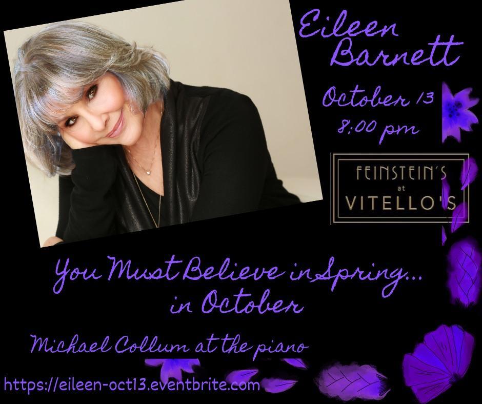But in October?! Yep! Make a date with the genuinely brilliant singer/performer Eileen Barnet at Feinstein’s at Vitello’s to see her one woman show “You Must Believe In Spring (in October).” Gotta love the title. It will be a fab and uplifting evening of wonderful songs. And perhaps a glass of wine or two, Ladies?