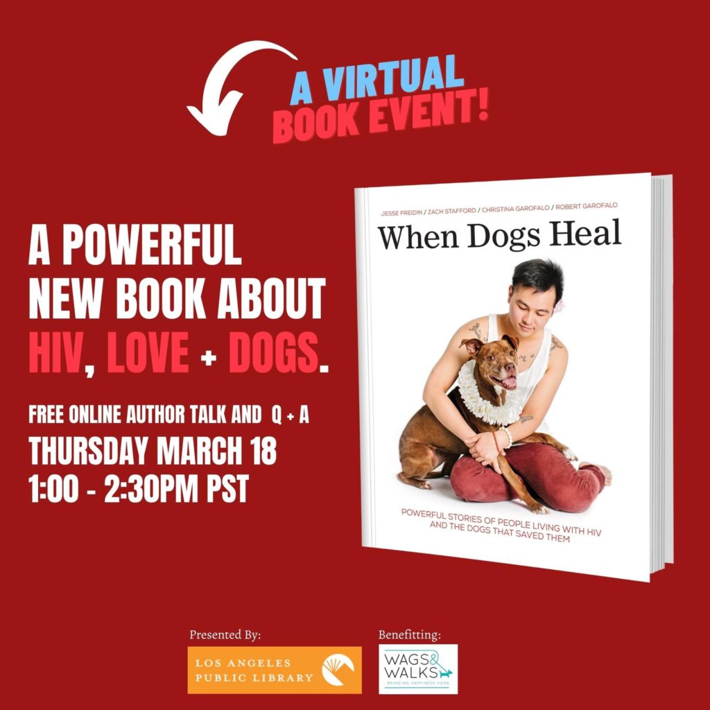 When Dogs Heal authors, Dr Robert Garofalo, whose HIV diagnosis inspired the book, and Jesse Freidin, award-winning dog photographer, will discuss the healing powers of dogs for people with HIV and other chronic illnesses. The event, moderated by the book’s co-author Christina Garofalo, will touch on the themes of unconditional love, resilience and survival. Also, Lesley Brog, the founder of Wags + Walks Rescue, will share how her world famous dog rescue helps save people through the unconditional love of a rescue dog. All proceeds from the sale of the book at the LAPL’s Author Talk will go directly to Wags +Walk Rescue.