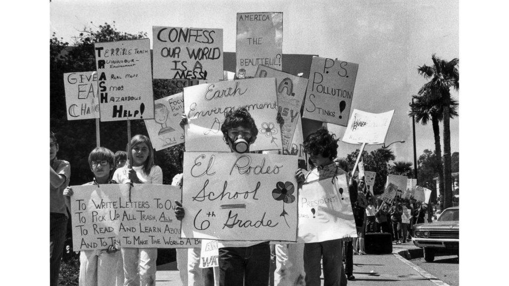 April 22, 1970: Sixth-grader Brad Frank, 11, wearing a gas mask, joins about 100 classmates during an Earth Day march on Wilshire Boulevard. (George Fry / Los Angeles Times)