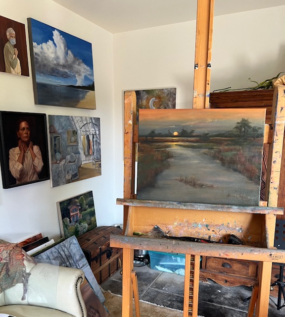 Sarah Brooke is an artist and an actress living and working in Los Angeles. After over 40 years on stage and screen, she decided to try her hand at painting. With the help of some fine teachers at the Kline Academy of Art in LA, where she studied classical oil painting techniques, she discovered a new passion. She loves to paint actors acting on stage, wetlands and beaches, odd animals and beautiful little bits of nature. Sarah can still be found onstage now and then, acting at Ensemble Studio Theatre Los Angeles and Pacific Resident Theatre.