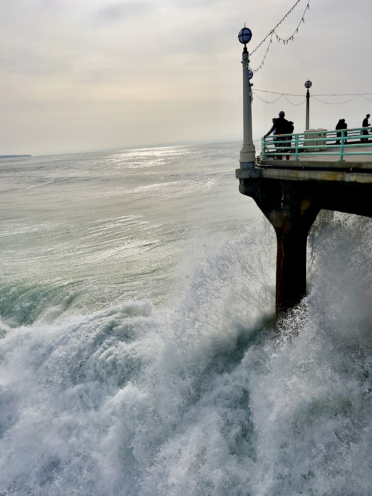 “But I would miss the seasons!” cry friends and family back in the Midwest when any debate about “weather” and “seasons” sets off. They think Los Angeles has none. Seasons, that is. Their romanticism of turning autumn leaves, crisp white Christmases; the bouncing robins of spring, and yes, even the bright green humidity of summer contributes to the notion that seasons are best served extreme. But we here in sunny southern California know otherwise… because we do have seasons! They’re simply more subtle, usually unpredictable, but always notable and appreciated. For example, this winter (so far) has offered up a series of hearty rainstorms, the brushing of snow in higher elevations; depending on what trees exist in your neighborhood, crisp orange and yellow leaves remain piled from the autumn months, and at our beaches… well, wild, wild surf. In fact, this winter brought such dramatic, pier-pounding waves that the events, up and down the coast, became newsworthy. This one, captured here in “Wild Waves of Winter,” brought heaving horizons, rolling, undulating sets of shore smashers, and a whole lotta shakin’ of piers like this sturdy one in Manhattan Beach. It was huge. It was exciting. It drew crowds. Welcome, my friends, to winter in sunny, showy, spine-tingling Los Angeles!