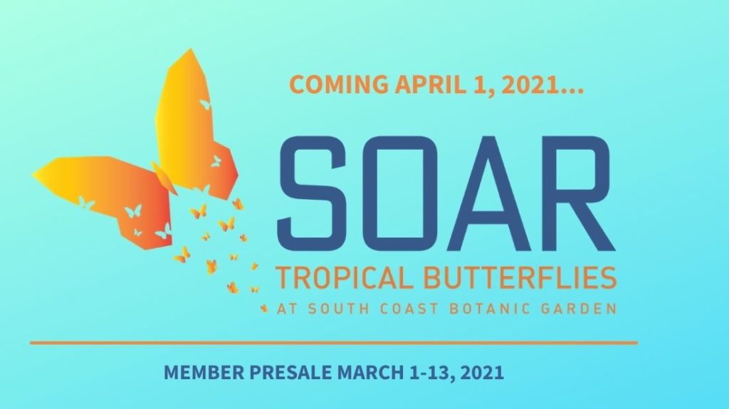 SOAR is a new exhibit at South Coast Botanical Gardens featuring lovely tropical butterflies and a newly built butterfly pavilion including an emergence chamber and a newly planted and blooming garden area. You will be soaring with the thrill of this new butterfly experience, Tomatoes.