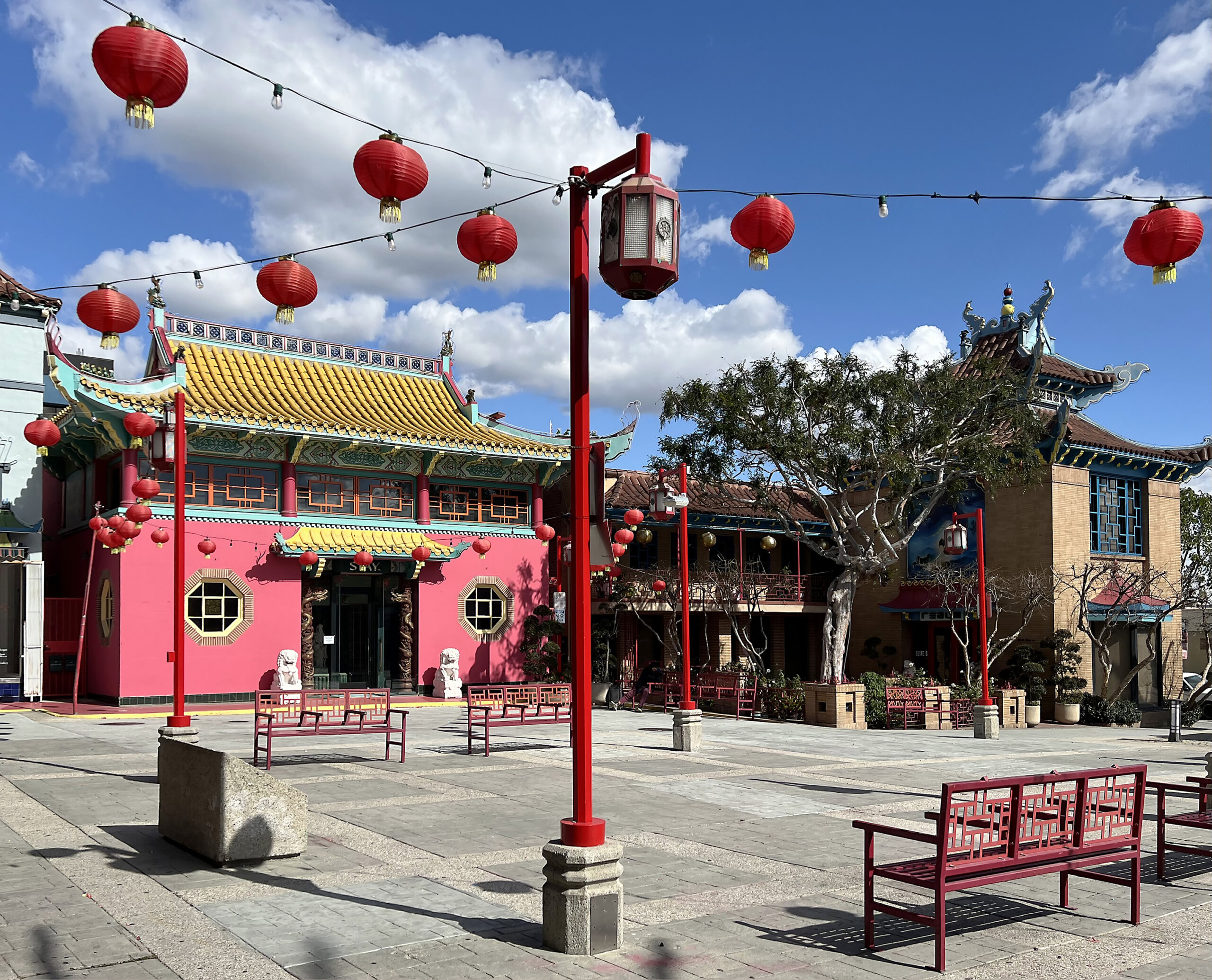 Every great city has its neighborhoods. Its enclaves. Its special sections. And in cities that revel in colorful, creative diversity, certainly the case in Los Angeles, many of those neighborhoods are built around a specific ethnicity. Some of LA’s most vibrant “ethnic enclaves” include Little Ethiopia, Little Tokyo; Cambodia Town, Little Bangladesh. Koreatown; Olvera Street, and, of course, Chinatown. Yes, that Chinatown. The one made famous by Jack Nicholson’s cut nostril, the water wars of the 1930s; a stunning Faye Dunaway, and the notorious line, “Forget it, Jake. It’s Chinatown.” That dark, fictional legacy was set in a location originally called “New Chinatown,” which was established in the mid-1800s in an area south of where it exists today. The current Chinatown, as defined by TripSavvy, now “encompasses less than a square mile bordered by Main Street to the East, Yale Street to the west, Cesar Chavez to the south, and Bernard Street to the north,” and that square mile buzzes with the contemporary urban vibrance of art galleries, unique shops, restaurants of amazing variety, and colorful Asian flair, from the architecture to the artfulness of a simple plaza… as captured by this photograph titled, “Plaza in Pink.”