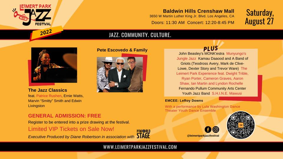 Their mission is to celebrate jazz, community, and the cultural heritage of the historic South Los Angeles neighborhood of Leimert Park. Admission is free, but VIP packages are available including shaded seating, drink tickets, and a meal.