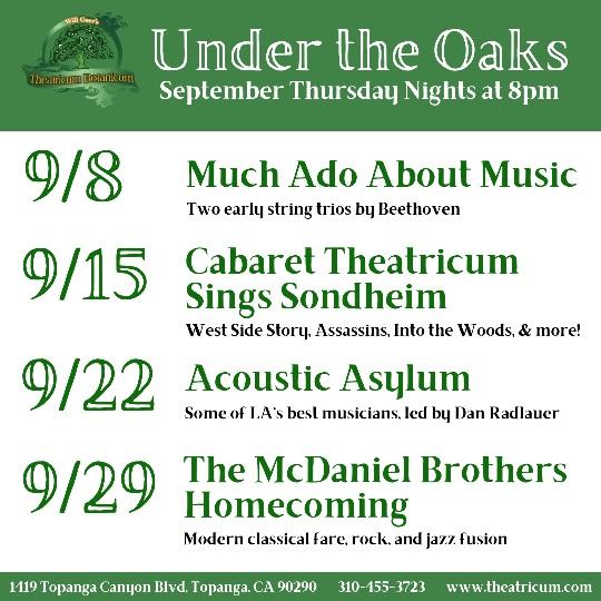 Theatricum Botanicum’s “Under the Oaks” salon series, offers four evenings in September of performance and song on the company’s spectacular outdoor stage in Topanga. First Up… the Classical Music Concert: “Much Ado About Music” presenting two early string trios by Beethoven. Enchanting!