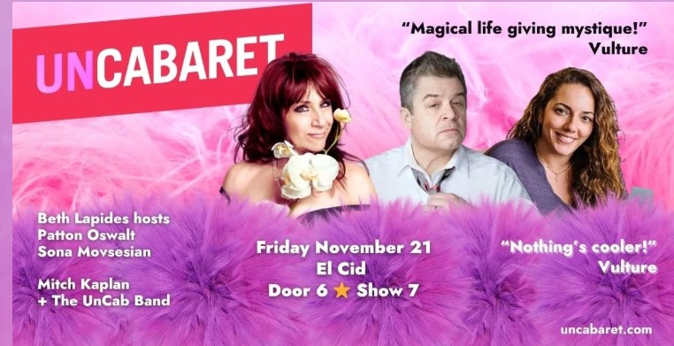If you’ve watched, heard, or read the news any time this year, you’re most likely certain of one absolute truth: we could all use a good laugh. Luckily, Los Angeles is never at a loss for comedy events, and this month is no exception. Uncabaret, a show that basically birthed the “alt-comedy” scene in these parts, and has been around for eons…as have I. The show is produced, curated, and hosted by the adorable Beth Lapides, who has always managed to attract the hippest and funniest current comics on the scene. Uncab, as its followers call it, used to be a weekly happening in WeHo, and while its venues and frequency have changed, the vibe has remained constant: a cool way to see cool comedy. This month you can catch the show – featuring one of my favorite comics, Patton Oswalt – at El Cid in Silverlake, on Friday, November 21st. Doors open at 6:00 pm, show starts at 7:00. GET THE DETAILS.