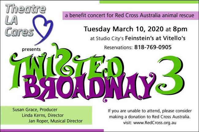 Theatre LA Cares, LA’s newest producing company, will present its 3rd benefit concert “Twisted Broadway 3” at Vitello’s, with a fab cast, musical direction by Jan Roper, directed by Linda Kerns and produced by Susan Grace. It will be the most fun Tomatoes can have while supporting the Red Cross Australia Animal Rescue.