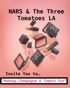 And what better way to celebrate women by celebrating and treating yourself to this NARS and Three Tomatoes LA Beauty Event, “Makeup, Champagne and Tomato Fun”! Ooh La La! NARS, the wonderful French cosmetics and skincare company and The Three Tomatoes LA (moi) are teaming up for the first time to host this special FREE and Fun event at the NARS beautiful boutique, on Melrose Avenue. Get your tickets now…it is filling up!