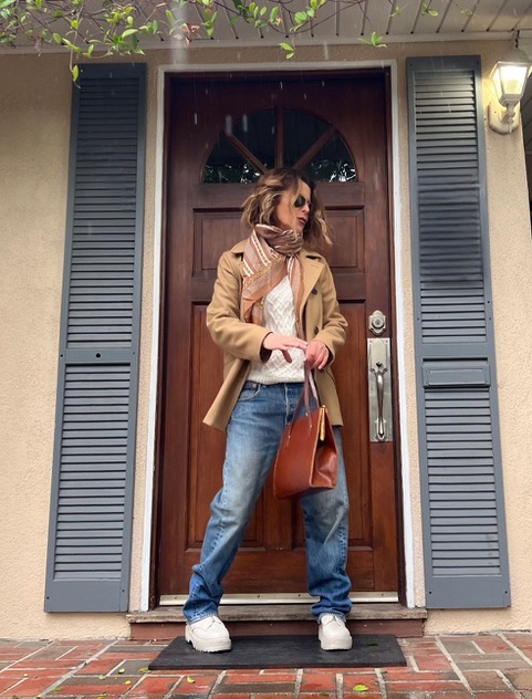 I don’t know about you but there are certain colour and fabric combinations that evoke the same feeling every time I see them like this classic casual look that I’m wearing today. The perfectly clear mid-tones on simple straight forward garments feel preppy traditional sophisticated and very east-coast Americana. I’ve got on a pair of baggy Levi 501s, and a Spring-weight fisherman’s sweater, Zara. The sweater gives me the look of a heavy cable-knit, but the lighter weight allows me to add a wool coat, J Crew, without overheating. The coat’s hybrid style is a cross between a pea and trench and the shorter length makes it more wearable in LA’s winter weather. I went with an off-white lug bottom boot, Gisele Tune.