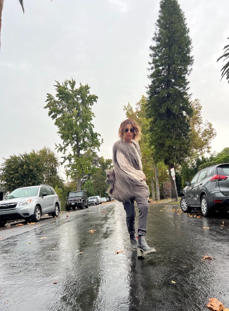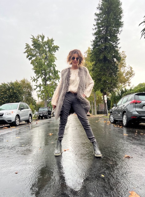 LA has a particular brand of style. It’s a cool casual mix inspired by our mostly great weather and influenced by Hollywood rock and roll and the beach. We are more sportswear and item driven rather than outfits or suits. I’m using a grey palette with a bump of sparkle along with a focus piece to uniform my casual separates. A focus piece draws the eye in then releases it to see everything else, collectively. This is key when styling separates. My 3/4 length faux fur vest, Hawke & Co., not only catches the eye it adds texture and proportion. The grey colour keeps it from looking over-the-top because it ties in with the rest of my greys.
