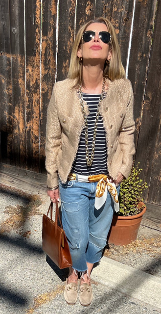There are a lot of reasons to love a casual fusion of uptown and downtown. It’s a great way to utilize your garments from different seasons and a fun way to combine different trends to create a look that’s expressive and truly your own. It’s still hot in LA and committing to Fall isn’t possible but a fusion like what I’m wearing today is a great way to ease into the season. My gold boucle’ short colorless blazer, Gisele, has a subtle sprinkling of sequins that makes it feel like a Fall/Holiday item, but its weight and shape is definitely year ‘round. For me, it’s all about the raw edge that gives it a more casual feel and it inspired my choice of wearing it with this raw edge cropped patched jeans Zara. Even though both pieces are polar opposites they have the raw edge detail in common to makes them fashionable friends.