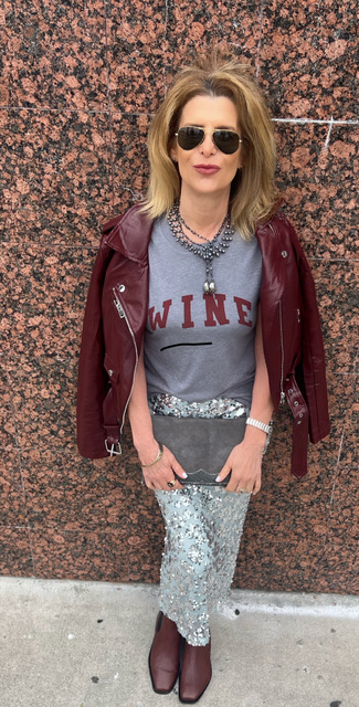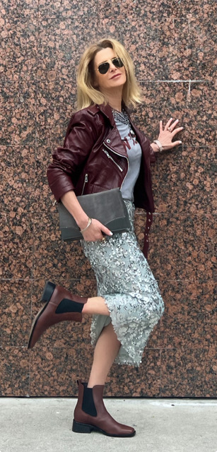 My screen t-shirt, Suburban Riot, boldly displays my favorite drink and is the IT colour trending, right now. The rich deep red tones in burgundy oxblood and brown are all trending colours for Autumn/Fall 24. This particular group of colours are especially beautiful when they’re paired with a contrasting cool tone like grey. With that in mind, I brought in a vegan leather motorcycle jacket in oxblood, Amazon. The jacket’s reflective hardware prompted my choice of my silver/grey sequins skirt, Zara. It’s always great when one item inspires the next; unfortunately, it doesn’t always work that way. I went with a pair of chocolate brown Chelsea boots, Sam Edelman, to balance out the heaviness of the jacket and to ground my look.