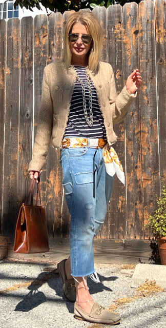 Because the jacket’s got the whole Chanel vibe going; I’m using my gold/white chain print Chanel scarf for a casual belt and my neutral tone suede loafers with the gold bit link, LK Bennett London, to drive it home. Nothing screams Summer more than a nautical stripe t-shirt, Juicy Couture. The bateau neck looks great under the cropped blazer and the inky blue and white stripe is a great contrast to the gold. I had to finish my look with a chunky gold rapper chain, Amazon. It adds the perfect amount of pop and playfulness to my seasonless fusion.