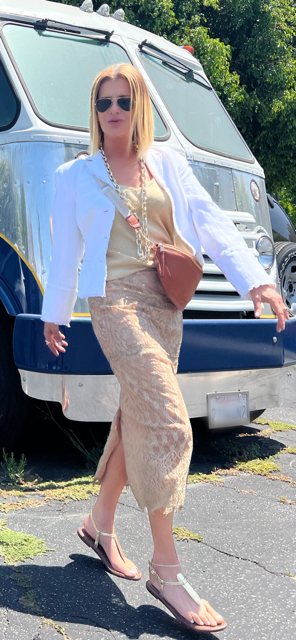 The shape of both pieces creates a nice straight line which helps give my body some length especially with my flat gold metallic sandals, Sam Edelman. I brought in a shorter length white linen jacket, Claude Barthelemy Paris, that hits pretty much at the bottom hem of my top to keep that straight line intact even though it’s a different colour. Had I gone with a longer jacket it would cover too much of my body, break the line, and make me look really short. This jacket has some nice fraying detail similar to the lace panels on my skirt – I didn’t really notice the similarity until I put it on. Don’t you love when it just works out? In my effort to keep it casual I went with a long chunky over-the-top rapper chain, Amazon. Stylistically it couldn’t be more opposite to my other garments and that’s why it works. It’s the right colour and length and it brings in some weight and heaviness that takes my look way down. I’m also using a leather crossbody fanny pack, Universal Thread, rather than a handbag to keep it casual and more “street”.