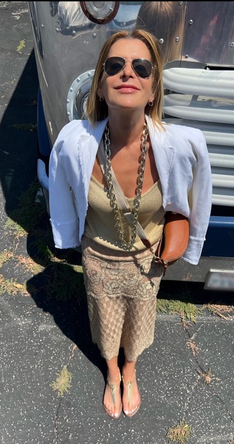 I’ve always been about getting as much as I can out of my wardrobe and that means not seeing things as they are or by season or as dressy or casual rather as individual items that I can put together to create a particular type of look. My casual look today is a bit deceptive because it’s comprised of mostly gold metallic pieces. Metallic garments especially gold have the ability of tricking our brains into seeing them as dressy so if you’re going for a casual vibe and you’re using metallic pieces you need to know how to put them together so you can pull off the look. First and foremost… you’ve got to go for it! I’m wearing the sheer gold lace and glitter skirt that I made from my Grandma’s evening gown, Victor Costa and paired it with a metallic gold knit tank, St John.