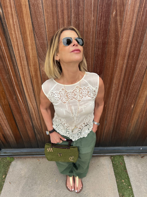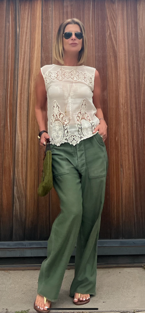 A simple way to pump up a really casual look is to add a few subtle touches of metallic. We don’t want to go over-the-top disco ball because then our look would no longer be casual. I’m wearing my mens Army fatigues, vintage and an eyelet blouse, Maje Paris. I love pairing masculine and feminine items because if done right makes for a look that’s a little more interesting without a lot of effort. Choosing the right garments that work proportionally well together for our body types is key to every look especially one like this. My fatigues are a few sizes too big (that’s the way I like them) but it makes them really high waisted. On someone with no waist and short legs it’s a lot of body coverage and definitely not the best look. BUT…when combined with a top that is fitted and can be worn over the pant it can give the illusion of length and proportion. Also, the raglan cut sleeve creates a broader looking shoulder for that fabulous T shape. These details are important especially when styling your casual look with flat sandals.